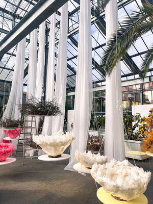 Zwischen den Stahlträgern hängen Installationen aus frischen und getrockneten Kräutern, kombiniert mit kräftig blühenden Sommerstauden. Unter Glasglocken warten ausgewählte Kräuter darauf, entdeckt zu werden. Wer eine Glocke hebt, wird von einem intensiven, aromatischen Duft umhüllt – ein direkter, eindrucksvoller Zugang zur Pflanzenwelt der Orangerie.