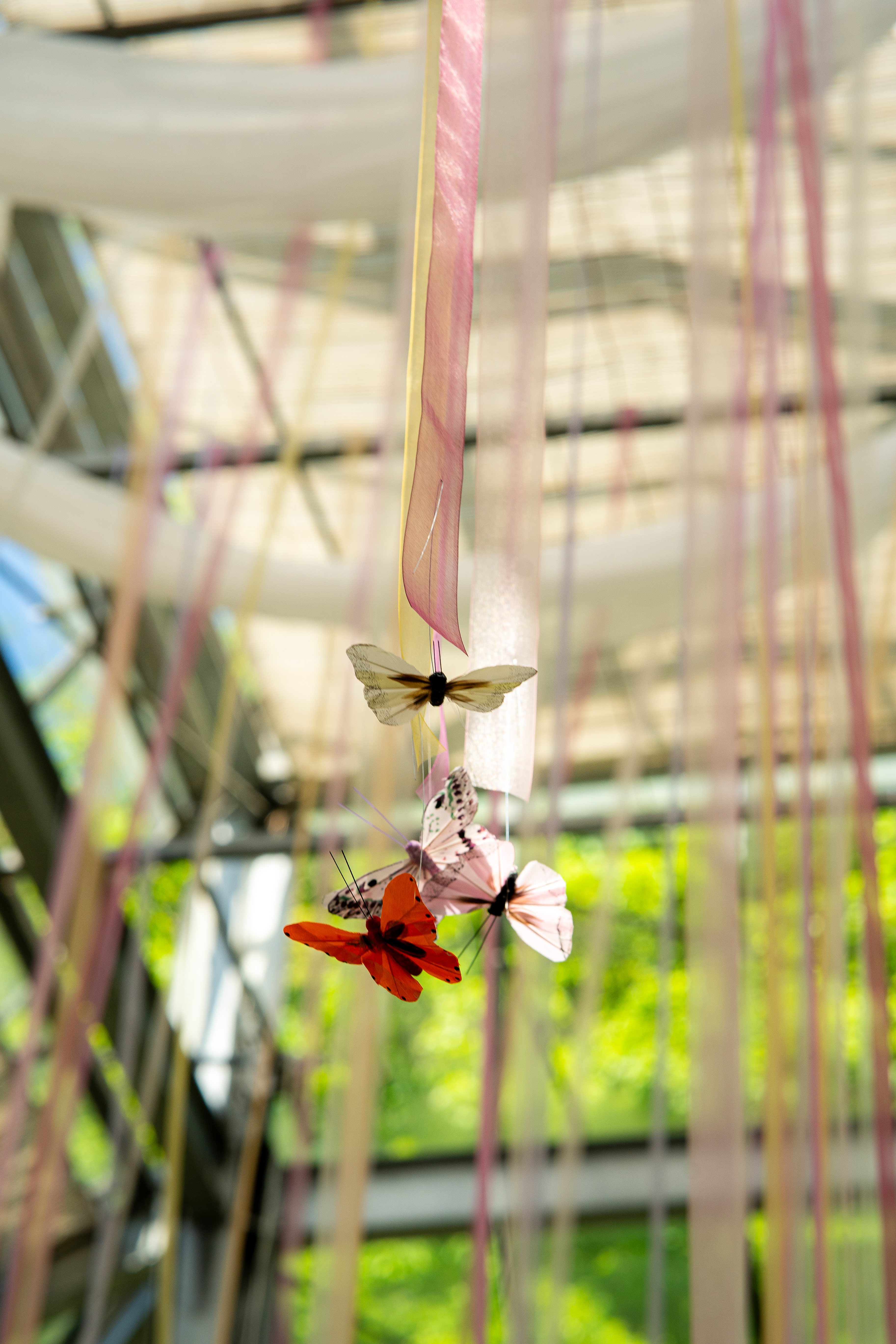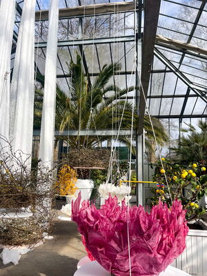 Im Zentrum der Ausstellung erhebt sich ein farbenprächtiger, fantasievoll gestalteter Baum, dessen Zweige sich leicht im Luftzug bewegen. Wie frisch ausgeschüttelt von Frau Holle, schweben zarte Blüten durch den Raum.