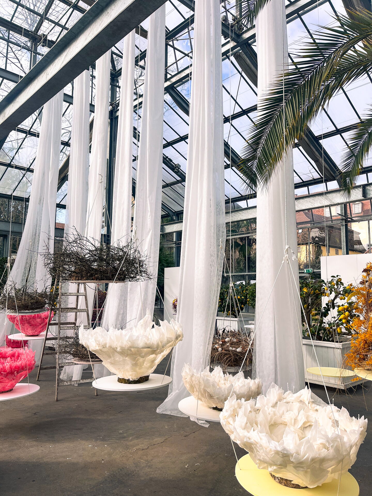 Unter gläsernen Glocken warten filigrane Blütenwerkstücke darauf, entdeckt zu werden. Einige dürfen vorsichtig angehoben werden – und sofort entfaltet sich ein feiner, natürlicher Blütenduft. Ein Erlebnis für Augen, Nase und Herz.