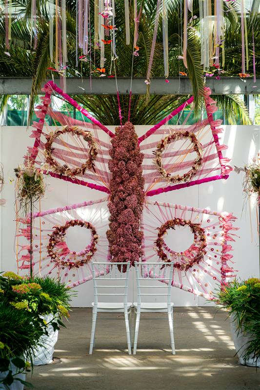 Sommerjasmin, frische Beet- und Balkonpflanzen, getrocknete weiße Blüten und leuchtende rote Rosen verbinden sich zu einer duftenden, harmonischen Komposition. Zarte Bänder, Blütenblätter, ein Spalierweg mit Glasvasen und kunstvoll arrangierte Sträuße runden das Gesamtbild ab. Unter Glasglocken präsentieren sich Rosen in ihrer vollendeten Form.